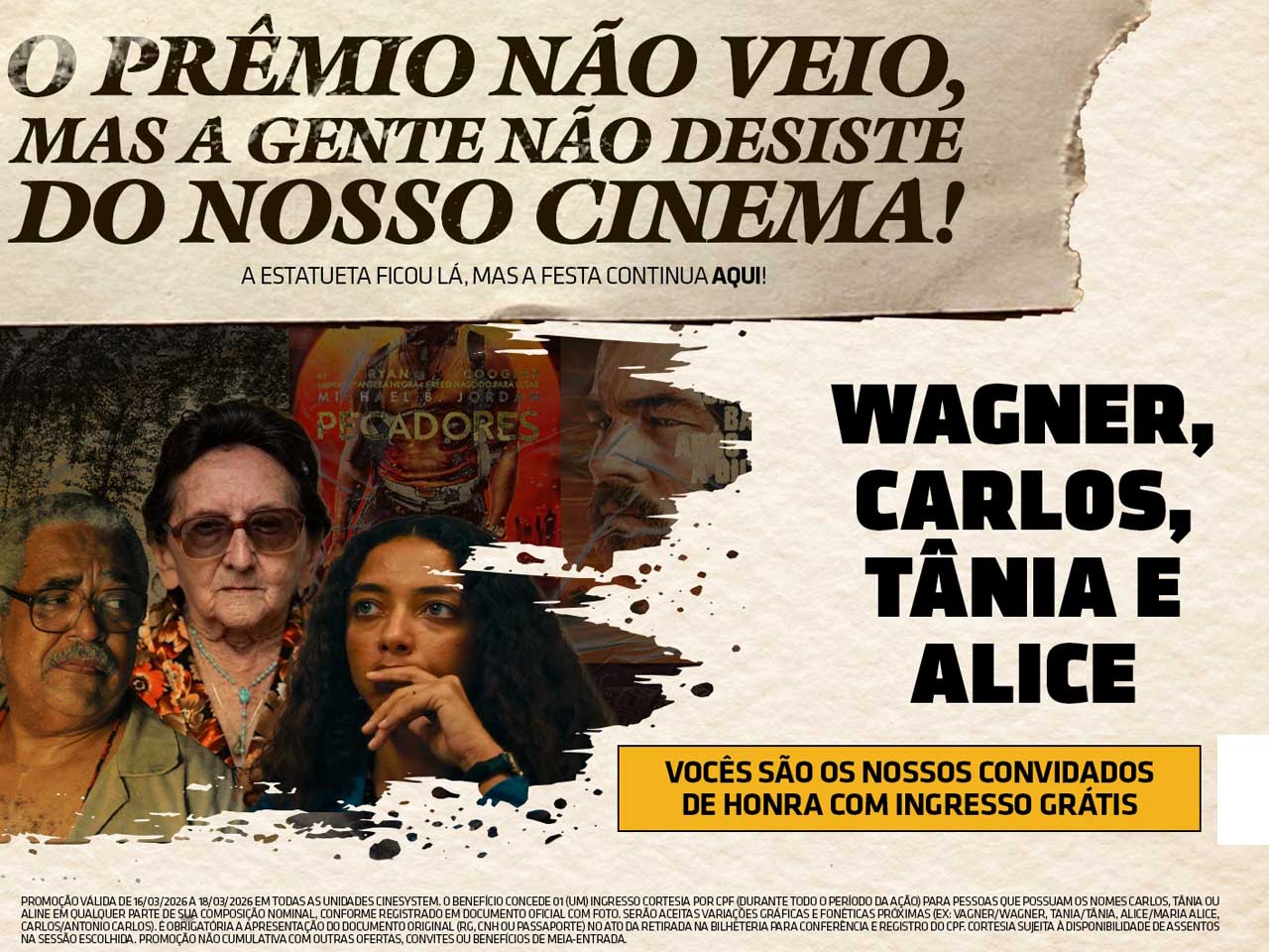 Entre 16 e 18 de março, clientes chamados Wagner, Carlos, Tânia, Alice ou Walter podem retirar ingressos de cinema grátis na bilheteria de qualquer multiplex da Cinesystem, sujeito a disponibilidade