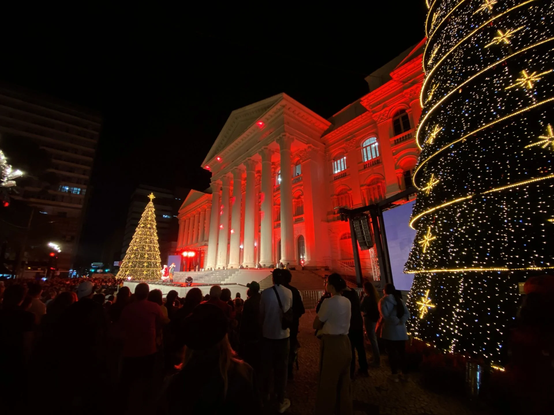 À noite, na Praça Santos Andrade, o espetáculo Abrace o Mundo será apresentado às 20h, com as escadarias e colunas do prédio histórico da UFPR transformadas em palco e cenário para a história de um menino curioso sobre o Papai Noel.